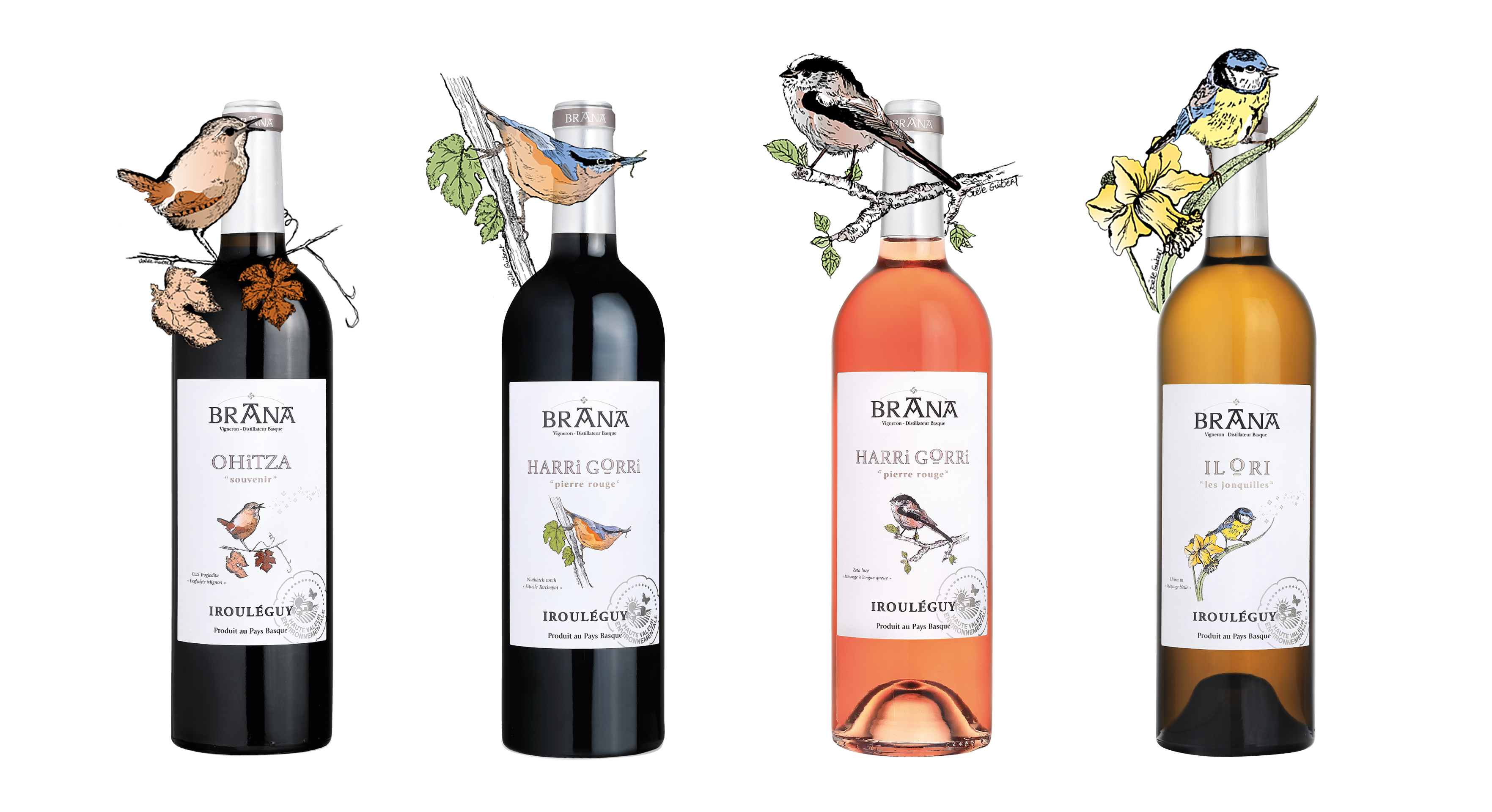 Création d'une gamme où les oiseaux sont à l'honneur. Jean Brana a disposé plus de 150 nichoirs dans ses vignes pour préserver la nature et ses précieux auxiliaires. La totalité du vignoble est en HVE niveau 3 (haute valeur environnementale ) et BIO depuis 2020. J'ai réalisé, d'après un descriptif que Jean Brana m'a donné les illustrations des oiseaux nichants dans ses vignes.